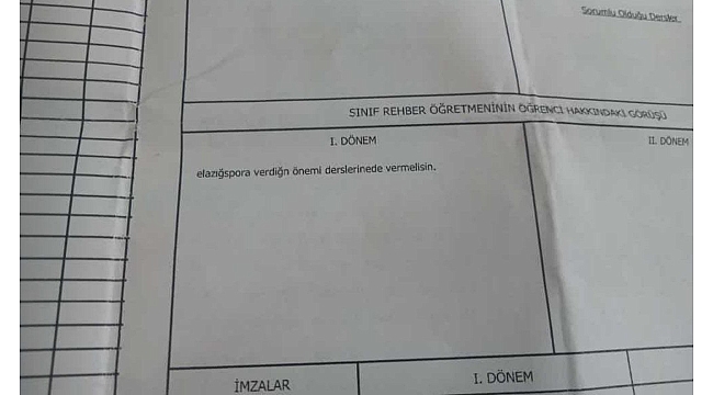 Tüm Türkiye'de olduğu gibi Elazığ'da da öğrenciler 2022-2023 eğitim-öğretim yılının ilk dönemini tamamlayarak karnelerini aldı. Okullarda yaşanan karne heyecanı bir kolejin 11. sınıfında öğrenim gören öğrenci için farklı duygular taşıdı. İlk dönem karnesini alan öğrenciye, sınıf rehber öğretmeni tarafından yazılan not şaşkınlığa neden oldu. "Elazığspor'a verdiğin önemi derslerine de vermelisin" yazılı notu görenlerin yüzünde tebessüm oluştu.
