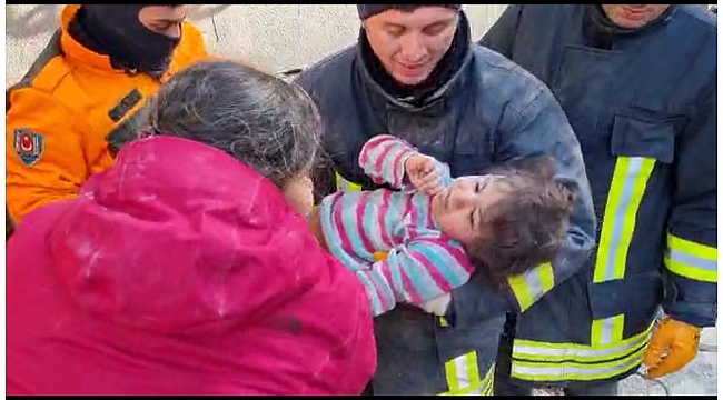 Kahramanmaraş merkezli depremlerden etkilenen Hatay'da 3 katlı bir binanın 1. katındaki kolon arasına sıkışan 4 yaşındaki kız çocuğu arama kurtarma ekiplerince enkaz altından sağ salim çıkartıldı.
