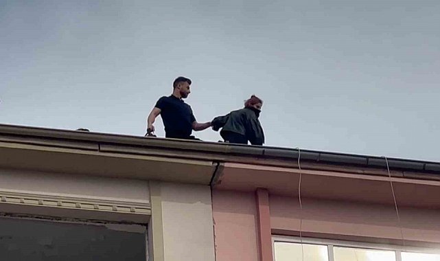 Elazığ'da depremde ağır hasar gördüğü için boşaltılan 8 katlı binanın çatısına çıkan kadını ekipler ikna ederek indirdi.