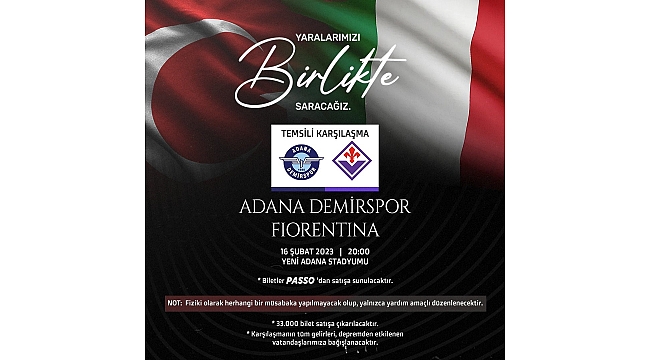 Adana Demirspor, depremzedelere destek olmak için İtaya Serie A takımlarından Fiorentina ile temsili bir karşılaşma yapacak. Fiziki herhangi bir müsabaka oynanmayacak olup, 33 bin bilet satışa çıkacak ve buradan elde edilen gelir AFAD'a gönderilecek.