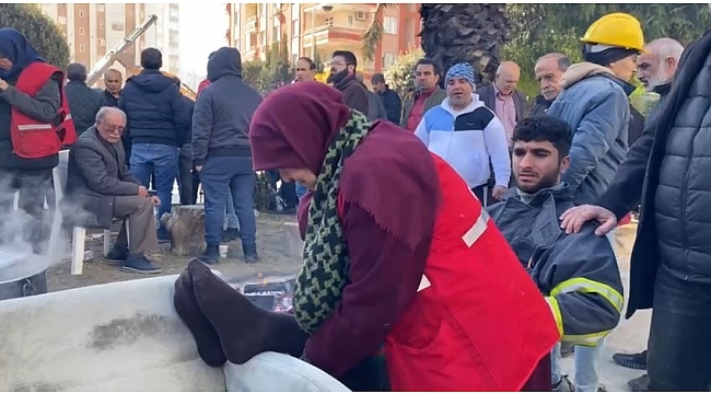 Depremin vurduğu Adana'da saatlerdir enkaz başında görev yapan arama kurtarma görevlisinin ayakları şişti. Gencin yardımına 73 yaşındaki Kızılay gönüllüsü Leman Uçar koştu. Anne şefkatiyle yaklaştığı gencin çoraplarını çıkaran Leman teyze, ayaklarına krem sürerek, masaj yaptı. O anlar görenlerin içini ısıttı.