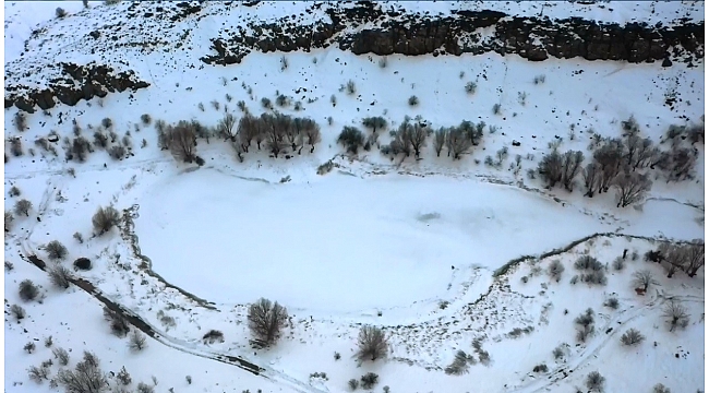 Sülüklü gölün buz tutması kartpostallık bir görüntü oluştururken, bölge dron ile görüntülendi.