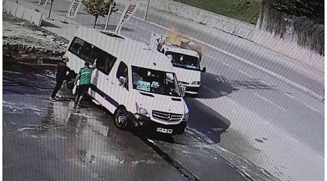 Seyir halindeki pikabın kasasında bulunan kartonların yanma anı ve sürücünün aracı benzin istasyonuna çekerek araç yıkama hortumuyla söndürmesi saniye saniye güvenlik kamerasına yansıdı.