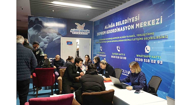 Aliağa Belediyesi, merkez üssü Kahramanmaraş olan ve 10 ili etkileyen 7,7 ile 7,6 büyüklüklerindeki depremlerden etkilenen vatandaşların sorunları en aza indirmek için Koordinasyon Merkezi kurdu. Aliağa Gençlik Merkezinde kurulan Aliağa Belediyesi Deprem Koordinasyon Merkezinde; depremzedelerin Aliağa'ya nakil, yerleştirme ve her türlü ihtiyaçları karşılanıyor. Başvuru sonrası kayıtları alınan depremzedelerin barınma ve tüm ihtiyaçları temin edildikten sonra, belediye ekiplerince barındıkları yerlere ulaştırılıyor.