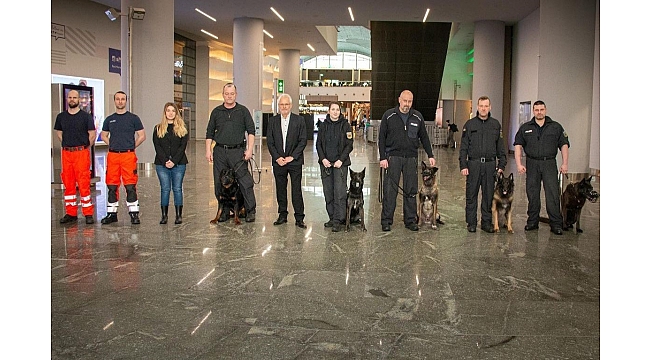 Almanya'dan gelen özel eğitimli arama kurtarma köpekleri ile birlikte bir grup polis memuru İstanbul'da Başkonsolos Johannes Regenbrecht tarafından karşılandı.