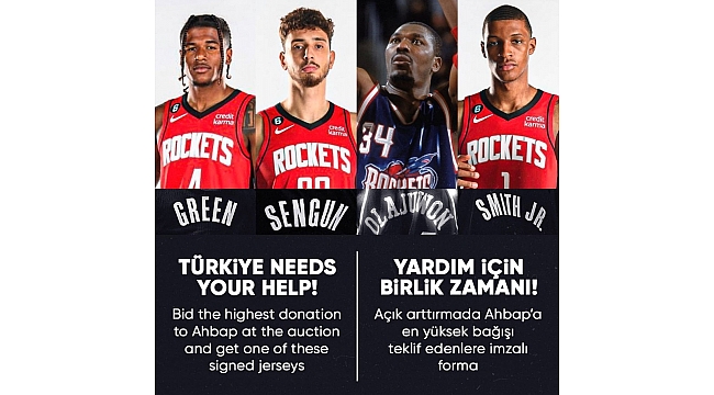 NBA'de Houston Rockets forması giyen milli basketbolcu Alperen Şengün, depremzedelere yardım için kendi formasının yanı sıra Rockets'ın efsanesi Hakeem Olajuwon ile takım arkadaşları Jalen Green ve Jabari Smith'in imzalı formalarını açık artırmaya çıkardı.