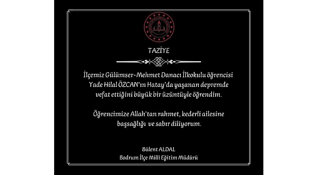 Bodrum İlçe Milli Eğitim Müdürü Bülent Aldal, yaptığı paylaşımda "İlçemiz Gülümser Mehmet Danacı İlkokulu öğrencisi Yade Hilal Özcan'ın Hatay'da yaşanan depremde vefat ettiğini büyük bir üzüntüyle öğrendim. Öğrencimize Allah'tan rahmet, kederli ailesine başsağlığı ve sabır diliyorum" dedi.