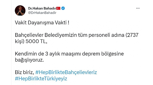 Bahçelievler Belediye Başkanı Dr. Hakan Bahadır sosyal medya hesaplarından yaptığı paylaşımda, "Vakit dayanışma vakti. Bahçelievler Belediyemizin tüm personeli adına (2 bin 737 kişi) 5 bin TL. Kendimin de 3 aylık maaşımı deprem bölgesine bağışlıyoruz. Biz biriz #HepBirlikteBahçelievleriz ve #HepBirlikteTürkiyeyiz" ifadelerine yer verdi.