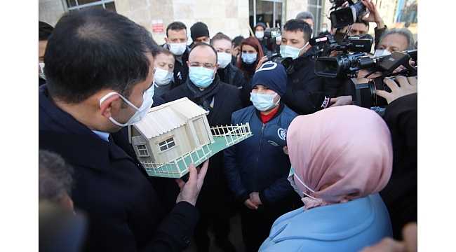 Elazığ depreminin birinci yıl dönümünde kente gelen Çevre ve Şehircilik Bakanı Murat Kurum, deprem konutlarını yerinde inceledi. Bakan Kurum'un ziyaretinde 14 yaşındaki Emre Kaya, geri dönüşüm malzemelerinden yaptığı maket evi hediye etti.