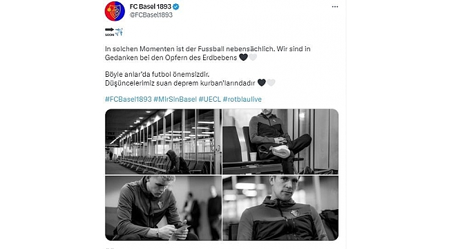 Trabzonspor ile UEFA Avrupa Konferans Ligi Play-Off Turu'nda karşılaşacak olan İsviçre temsilcisi Basel, yaptığı paylaşımda, "Böyle anlarda futbol önemsizdir. Düşüncelerimiz şu an deprem kurbanlarındadır" ifadelerini kullandı.