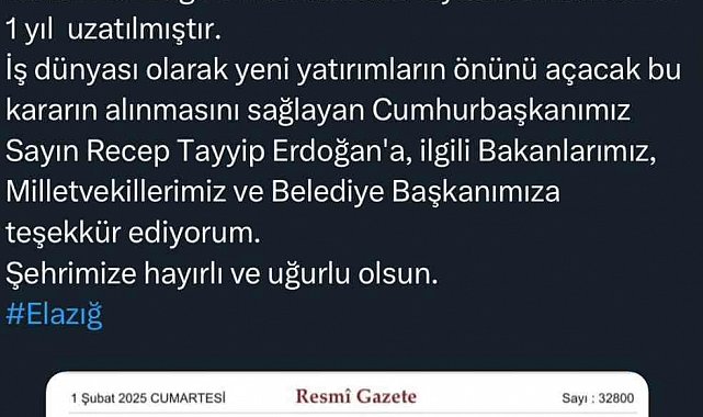 Elazığ'da uygulanan teşvikte 6. bölge avantajlarının devam edip etmeyeceği merak konusu olmuştu. Elazığ Ticaret ve Sanayi Odası Başkanı İdris Alan müjdeyi verdi ve Cumhurbaşkanı Recep Tayyip Erdoğan'ın imzasıyla teşviklerin süresinin 1 yıl uzatıldığını açıkladı. Başkan Alan sosyal medya hesabından konu ile ilgili şu açıklamayı yaptı: