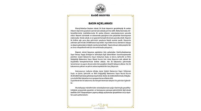 Elazığ Belediye Başkanı Şahin Şerifoğulları sosyal medyadan yaptığı açıklamada, "Elazığ Belediye Başkanı olarak 24 Ocak depremin gerçekleştiği ilk andan itibaren depremin yaralarını sarmak için sahada yerimizi aldık. Bakanlarımızla, milletvekillerimizle, teşkilatlarımızla ilk andan itibaren vatandaşlarımızın yanında olduk. Deprem sürecinde ve sonrasında yaptığımız tüm çalışmalar kamuoyunun malumudur. Sokak sokak, ev ev gezerek hemşerilerimizin yanında olduk. Deprem ile birlikte ağır yara alan şehrimizin yaralarını büyük oranda sardık. Depremin ardından şehrimizde 24 bin 800 konut inşa edildi. İnşa edilen konut alanlarının altyapı ve ulaşım çalışmalarını büyük oranda tamamladık. Yapımı devam eden projeleri bir an önce nihayetlendirmek için de canla başla çalışıyoruz. Deprem süreci boyunca yaptığımız tüm çalışmaları Cumhurbaşkanımız Recep Tayyip Erdoğan'ın talimatıyla ilgili bakanlıkların koordinasyonunda yürüttük. İçişleri Bakanımız Süleyman Soylu ve Çevre, Şehircilik ve İklim Değişikliği Bakanımız Murat Kurum tüm süreç boyunca çok yüksek bir duyarlılıkla hemşehrilerimizle birlikte oldular. Her iki bakanımız şehrimizde tamamlanan ve yapımı devam eden tüm projelerin bizatihi takipçisi oldu. Her iki bakanımıza şahsım ve şehrim adına teşekkürü bir borç biliyorum. Kamuoyunun malumu olduğu üzere İçişleri Bakanımız Süleyman Soylu ve Çevre, Şehircilik ve İklim Değişikliği Bakanımız Murat Kurum 26.04.2022 Salı günü şehrimize teşrif etti. Bizler de milletvekillerimizle, il başkanımızla birlikte bakanlarımızın programlarına refakat ettik. Ziyaretlerde her iki bakanımız da hemşerilerimizin talepleri ile yakından ilgilendiler. Mustafapaşa mahallemizde vatandaşlarımızın yoğun katılımıyla gerçekleştirdiğimiz programda yaşanılan ve kamuoyuna yansıyan görüntülerle ilgili olarak özellikle CHP İl Başkanlığının yapmış olduğu açıklamalar gerçeklikten ve iyi niyetten uzak açıklamalardır" dedi.