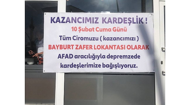 Bayburt halkının büyük özveriyle katkılarını sunduğu yardım kampanyalarına bir yenisi daha eklendi. Bayburt esnafı günlük kazançlarını deprem bölgesine göndermeye karar verdi. Kazançlarını bölgeye gönderme gayreti içinde olan esnaflara vatandaşların desteği de gecikmedi. Lokanta, berber, teknik servis ve taksici esnafının başlatmış olduğu kampanyaya esnaflar, bütün esnafların destek vermesini istediler. Lokanta sahibi Ozan Aydoğdu ve Alpay Aydoğdu kuzenler, günlük cironun 20 bin olduğunu duyurduktan sonra, zaman kaybetmeden parayı bölgeye ulaştıracaklarını ifade ettiler. Alpay Aydoğdu, birilerine vesile olmak adına bu kararı aldıklarını belirterek, "Allah mübarek eylesin, elimizdeki, avucumuzdaki her şeyi o tarafa doğru akıtmaya çalışıyoruz. Sadece biz değil bütün Bayburt. Sadece Bayburt değil, bütün ülkemiz, dünya ülkeleri. Allah hepsinden razı olsun, ellerinden geleni yapıyorlar. Biz de dedik ki elimizde avucumuzda bir şey kalmadı, bir ekmek teknemiz var orada da kazandığımız ne varsa Allah rızası için o bölgeye göndereceğiz. Allah acılarını hafifletsin, Allah bu millete bir daha böyle bir afet yaşatmasın. Kimse yanında bir şey götüremeyeceği gibi biz de kazancımızı götüremeyeceğiz. Yaptığımız hakkıyla yerine ulaşırsa ne ala, Allah niyetimizi kabul etsin inşallah. Yaptığımız bir su damlası kadar belki ama inşallah birilerine vesile olur" dedi.