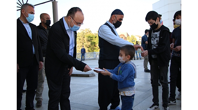 Vali Erkaya Yırık, İl Emniyet Müdürü Celal Sel ve İl Müftüsü Selami Aydın cami önünde sosyal mesafe kuralına dikkat ederek vatandaşlarla bayramlaştı, çocuklara şeker ikram ederek bayram harçlığı verdi.