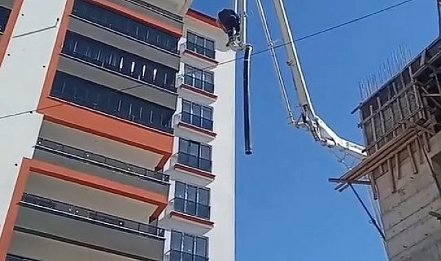 Elazığ'da bir işçi, beton pompa aracının hortumuna binerek metrelerce yüksekliğe çıkıp adeta ölüme meydan okudu. O anlar cep telefonu kamerasına yansıdı.