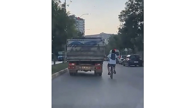 Olay, merkeze bağlı Abdullapaşa Mahallesi Prof. Dr. Turan Yazgan Caddesi'nde meydana geldi. Bisikletli bir çocuğun kamyon kasasına tutunarak yaptığı yolculuk yürekleri ağza getirdi. Hem kendisini hem de trafiği tehlikeye sokan gencin tehlikeli yolcuğu telefon kamerasına yansıdı.