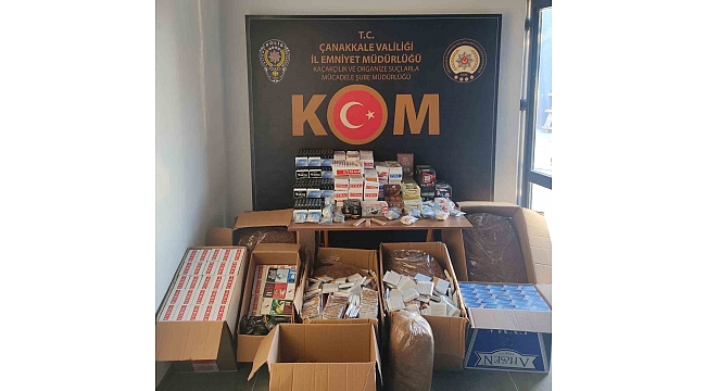 Çanakkale İl Emniyet Müdürlüğü Kaçakçılık ve Organize Suçlarla Mücadele (KOM) Şube Müdürlüğüne bağlı Kaçakçılık Suçları Büro Amirliği ekipleri, Tarım ve Orman Müdürlüğü görevlileri ile birlikte yaptığı çalışmalarda 5607 SKM suçundan, M.S.K ve Ö.İ isimli şahısların iş adresinde yapılan aramada, bin 415 adet kesilmiş TAPDK Bandrolü, 29 bin 740 adet doldurulmuş makaron, 27 bin 200 adet bandrolsüz boş makaron, 6 adet gümrük kaçağı nargile kömürü, 161 paket gümrük kaçağı sigara sarma kağıdı ve 90 kilogram kıyılmış sarmalık tütün ele geçirildi.