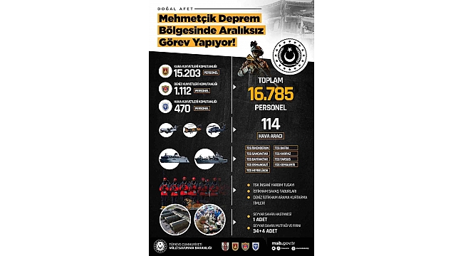 Milli Savunma Bakanlığı (MSB), deprem bölgesinde 16 bin 785 personelin görev aldığını bildirdi.