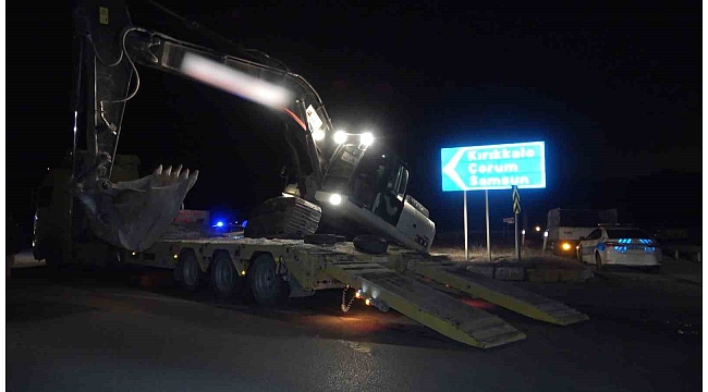 Kırıkkale'de deprem bölgesine giden tırın taşıdığı iş makinesi, kavşaktan dönmeye çalışırken devrildi.