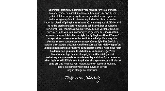 "Belirtmek isterim ki ülkemizde yaşanan deprem felaketinden 1 ay önce yasal hakkımı kullanarak kulübümün üzerine düşen yükümlülüklerini yerine getirmesini, aksi halde sözleşmemi feshedeceğime yönelik ihtarname gönderdim. İhtarnameden haberdar olan kulüp başkanımız bana ağza alınmayacak küfürler etti ve kadro dışı bırakacağı konusunda tehdit etti. Ben sükunetimi koruyarak işimi yapmaya devam ettim. Kulübün verilen 30 günlük süre içerisinde yükümlülüklerini yerine getirmedi. Buna rağmen yaşanan deprem felaketi nedeniyle Kulüp Başkanı Ahmet Yaman'ı arayarak sezon sonuna kadar kulübümde kalıp, bir kuruş bile almadan sezon sonuna kadar savaşacağımı söyledim. En doğru kararın bu olacağını düşündük. Gelinen süreçte Yeni Malatyaspor'un ligden çekileceğini bildirmesi ve bunun kesinleşmesi nedeniyle fesih hakkımın son gününde fesih hakkımı kullandım. Eğer Yeni Malatyaspor lige devam etseydi, kesinlikle sözleşmemi feshetmeyecek ve orada sezonu tamamlayacaktım. Aynı zamanda takım ligden çekildiği için son 3 ayı kalan sözleşmem otomatik olarak sona erdi. Bu nedenle Yeni Malatyaspor'un yapmış olduğu bu karalama kampanyasından dolayı son derece üzgün olduğumu belirtirim."