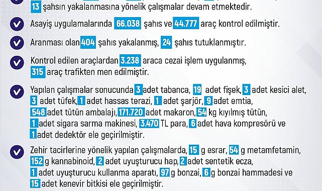 Yapılan çalışmalar sonucunda 3 adet tabanca, 19 adet fişek, 3 adet kesici alet, 3 adet tüfek, 1 adet hassas terazi, 1 adet şarjör, 9 adet emtia, 548 adet tütün ambalajı, 171 bin 720 adet makaron, 54 kilo kıyılmış tütün, 1 adet sigara sarma makinesi, 3 bin 470 TL para, 6 adet hava kompresörü ve 1 adet dedektör ele geçirildi. Zehir tacirlerine yönelik yapılan çalışmalarda ise 15 gram esrar, 54 gram metamfetamin, 152 gram kannabinoid, 2 adet uyuşturucu hap, 2 adet sentetik ecza, 1 adet uyuşturucu kullanma aparatı, 97 gram bonzai, 6 gram bonzai hammadesi ve 15 adet kenevir bitkisi ele geçirildi. Ayrıca kentte meydana gelen 35 trafik kazasında, 56 kişinin yaralandığı aktarıldı.