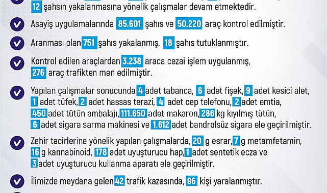 Yapılan çalışmalar sonucunda 4 adet tabanca, 6 adet fişek, 9 adet kesici alet, 1 adet tüfek, 2 adet hassas terazi, 4 adet cep telefonu, 2 adet emtia, 450 adet tütün ambalajı, 111 bin 650 adet makaron, 286 kilo kıyılmış tütün, 6 adet sigara sarma makinesi ve bin 612 adet bandrolsüz sigara ele geçirildi. Zehir tacirlerine yönelik yapılan çalışmalarda ise 20 gram esrar, 7 gram metamfetamin, 16 gram kannabinoid, 178 adet uyuşturucu hap, 1 adet sentetik ecza ve 3 adet uyuşturucu kullanma aparatının ele geçirildiği bildirildi. Kentte meydana gelen 42 trafik kazasında ise 96 kişinin yaralandığı aktarıldı. Aynı zamanda kaybolan 8 şahıs, 1 adet motosiklet ve 1 adet otomobilin bulunduğu öğrenildi.