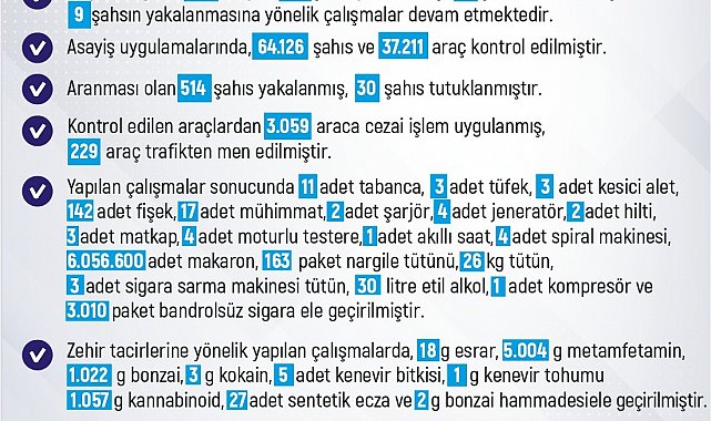 Yapılan çalışmalarda 11 adet tabanca, 3 adet tüfek, 3 adet kesici alet, 142 adet fişek, 17 adet mühimmat, 2 adet şarjör, 4 adet jeneratör, 2 adet hilti, 3 adet matkap, 4 adet moturlu testere, ladet akıllı saat, 4 adet spiral makinesi, 6 milyon 56 bin adet makaron, 163 paket nargile tütünü, 26 kilogram tütün, 3 adet sigara sarma makinesi tütün, 30 litre etil alkol, 1 adet kompresör ve 3 bin 10 paket bandrolsüz sigara ele geçirildi. Zehir tacirlerine yönelik yapılan çalışmalarda ise 18 gram esrar, 5 kilo 4 gram metamfetamin, 1.022 gram bonzai, 3 gram kokain, 5 adet kenevir bitkisi, 1 gram kenevir tohumu 1.057 gram kannabinoid, 27 adet sentetik ecza ve 2 gram bonzai hammaddesi ele geçirildiği bildirildi. Aynı zamanda kentte meydana gelen 35 trafik kazasında, 1 kişi hayatını kaybederken 38 kişi ise yaralandı.