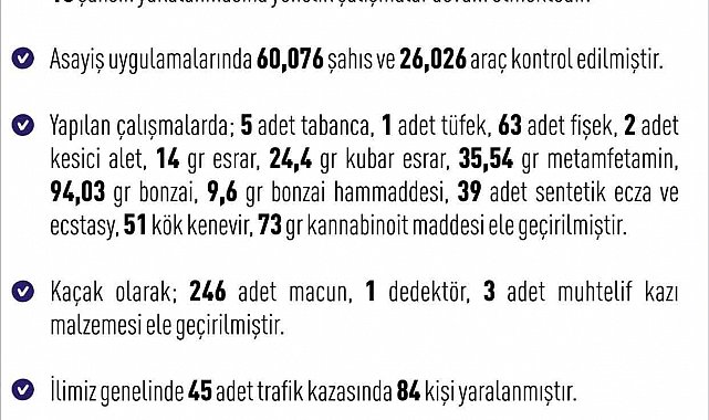 Çalışmalarda 60 bin 76 şahıs ve 26 bin 26 araç denetlendi. Kontrol edilen 12 bin 862 araçtan, 4 bin 155'ine cezai işlem uygulanırken 208 araç da trafikten men edildi.