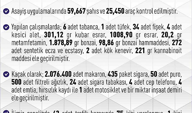 Yapılan çalışmalarda; 6 adet tabanca, 1 adet tüfek, 34 adet fişek, 4 adet kesici alet, 301,12 gram kubar esrar, 1008,90 gram esrar, 20,2 gram metamfetamin, 1.878,89 gram bonzai, 98,86 gram bonzai hammaddesi, 272 adet sentetik ecza ve ecstasy, 2 adet kök kenevir, 221 gr kannabinoit maddesi ele geçirilirken kaçak olarak ise 2 milyon 76 bin 400 adet makaron, 435 paket sigara, 50 adet puro, 500 adet filtreli ağızlık, 24 adet sigara tabakası, 4 adet cep telefonu, 4 adet emtia, hırsızlık kaydı ile 1 adet motosiklet ve bir miktar inşaat demiri ele geçirildi.
