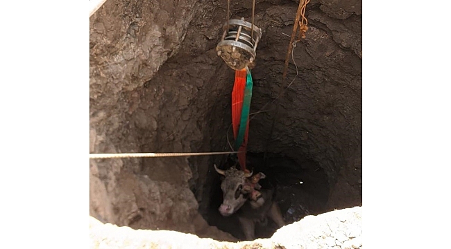 Elazığ'da 14 metrelik su kuyusuna düşen gebe inek, hayvan boğulmadan yetişen itfaiye ekiplerinin 1 saatlik çabasıyla sağ olarak kurtarıldı.