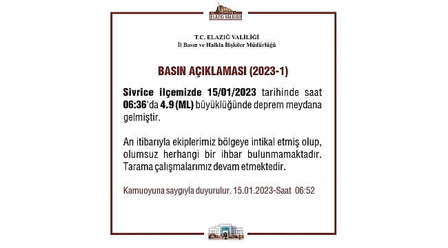 Afet ve Acil Durum Yönetimi Başkanlığı Deprem Dairesi Başkanlığından alınan bilgiye göre, saat 06.36'de merkez üssü Elazığ'ın Sivrice ilçesinde 4.9 büyüklüğünde deprem meydana geldi. Yerin yaklaşık 17 kilometre derinliğinde meydana gelen depremle ilgili olumsuz bir durum yaşanmadığı öğrenildi.