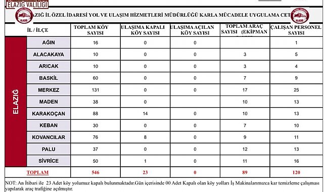 Elazığ'ın yüksek kesimlerinde etkili olan kar yağışı nedeniyle bazı köy yolları ulaşıma kapandı. Elazığ İl Özel İdaresi Yol ve Ulaşım Hizmetleri Müdürlüğü ekipleri, kapalı yolların açılması için çalışmalarını aralıksız sürdürüyor. İl genelinde toplam 546 köy yolundan 23'ünün kar yağışı nedeniyle ulaşıma kapalı olduğu bildirildi. Karakoçan ilçesinde 14, Kovancılar'da 8, Sivrice'de ise 1 köy yolu ulaşıma kapalı bulunuyor. İl Özel İdaresi ekipleri, karla mücadele kapsamında 89 araç ve 120 personel ile sahada çalışmalarını sürdürüyor.