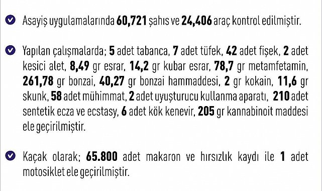 Yapılan çalışmalarda; 5 adet tabanca, 7 adet tüfek, 42 adet fişek, 2 adet kesici alet, 8,49 gram esrar, 14,2 gram kubar esrar, 78,7 gram metamfetamin, 261,78 gram bonzai, 40,27 gram bonzai hammaddesi, 2 gram kokain, 11,6 gram skunk, 58 adet mühimmat, 2 adet uyuşturucu kullanma aparatı, 210 adet sentetik ecza ve ecstasy, 6 adet kök kenevir, 205 gram kannabinoit maddesi, kaçak olarak 65 bin 800 adet makaron ve hırsızlık kaydı ile 1 adet motosikletin ele geçirildiği aktarıldı.