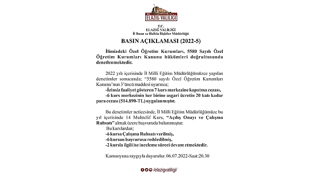 Valilik tarafından yapılan açıklamada, "İlimiz Özel Eğitim Kurumları, 5580 sayılı Özel Eğitim Kurumları Kanunu hükümleri doğrultusunda denetlemektedir. 2022 yılı içerisinde Milli Eğitim Müdürlüğümüzce yapılan denetimler sonucunda; '5589 sayılı Özel Eğitim Kurumları Kanunu'nun 3'üncü maddesi uyarınca; izinsiz faaliyet gösteren 7 kurs merkezine kapatma cezası, 6 kurs merkezinin her birine asgari ücretin 20 katı kadar 514 bin 890 TL para cezası uygulanmıştır. Bu denetimler neticesinde İl Milli Eğitim Müdürlüğümüze bu yıl içerisinde 14 muhtelif kurs, 'Açılış onayı ve çalışma ruhsatı' almak üzere başvuruda bulunmuştur. Bu kurslardan 6 kursa çalışma ruhsatı verilmiş, 6 kursun başvurusu reddedilmiştir, 2 kursla ilgili ise inceleme sürece devam etmektedir" denildi.