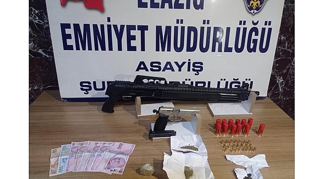 Elazığ Cumhuriyet Başsavcılığı koordinesinde İl Emniyet Müdürlüğü Asayiş Şube Müdürlüğü ekipleri tarafından 15 Aralıkta Sürsürü Mahallesi Tekin Sokakta meydana gelen 750 bin liralık hırsızlık olayı ile ilgili yapılan çalışmalar ve araştırmalar neticesinde olayın failinin 21 suç kaydı bulunan Y.A. (42) olduğu tespit edildi. 30 Aralıkta Y.A. isimli şahıs saklandığı adreste yakalanarak gözaltına alınırken, zanlının evinde yapılan aramada 1 adet siyah renkli pompalı tüfek, 1 adet kurusıkı tabanca ve 15 adet 7.65 milimetre fişek, toplamda 5 ayrı paket halinde sarılı kubar esrar ve metamfetamin uyuşturucu maddesi ele geçirildi. Y.A. isimli şahıs Emniyet Müdürlüğünde tamamlanan işlemlerinin ardından mahkemeye sevk edildi.
