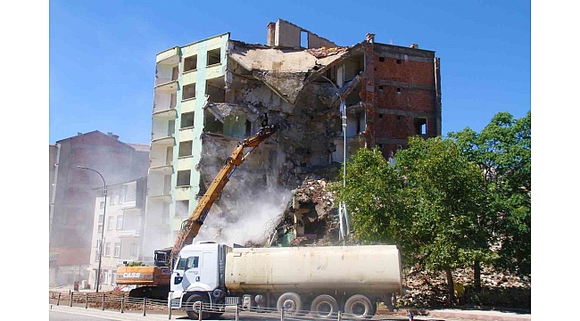 6 Şubat'ta Kahramanmaraş'ta meydana gelen yıkıcı depremlerden etkilenen Elazığ'da ağır hasar alan binaların yıkım çalışmaları devam ediyor. Bu çerçevede kent genelinde ağır hasar alan binaların bir an önce yıkılması için çevre güvenliğini alan firmalar çalışmalarını sürdürüyor.