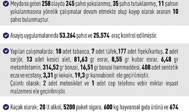 Yapılan çalışmalarda; 10 adet tabanca, 7 adet tüfek,177 adet fişek/kartuş, 2 adet sarjör, 13 adet kesici alet, 81,63 gram esrar, 8,55 gram kubar esrar, 6,48 gram metamfetamin, 314,52 gram bonzai, 16,51 gram bonzai hammaddesi, 408 adet sentetik ecza ve ecstasy, 3,31 gram kokain, 19,3 gram kannabionit, çalıntı olarak; 2 adet motosiklet ve 1 adet cep telefonu ve bir miktar inşaat malzemesi, kaçak olarak; 20 litre alkol, 5 bin 200 paket sigara, 600 killo hayvansal gıda ürünü ve 674 kilo balık ele geçirildiği bildirildi.