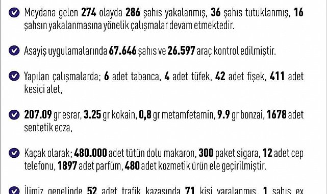 Elazığ'da son bir haftada meydana gelen 274 olayda 286 kişi yakalanırken 36'sı tutuklandı. Uyuşturucu, kaçak ürün ve silah operasyonlarında çok sayıda madde ve eşya ele geçirildi. Trafik kontrollerinde ise 3 bin 73 araca ceza kesilirken, 280 araç trafikten men edildi.