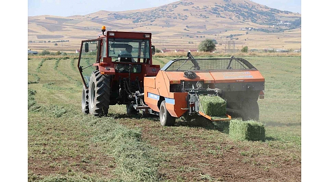 Elazığ'da hasat edilen yonca bitkisinin balyalama mesaisi başladı.