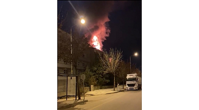 Elazığ'da depremde boşaltılan bir binanın çatısı alev alev yandı. İtfaiye ekipleri yangını diğer binalara sıçramadan söndürdü.