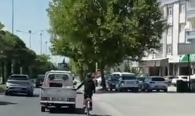 Elazığ'da bir bisiklet sürücüsü, kamyonetin arkasına tutunarak trafikte ilerledi. Tehlikeli anlar cep telefonu kamerası ile görüntülendi.