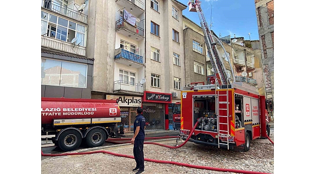 Elazığ'da 5 katlı binanın çatı katında çıkan yangın, itfaiye ekipleri tarafından söndürülürken, yangından dolayı gökyüzünü siyah dumanlar kapladı.
