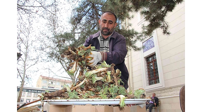 Elazığ'da baharın gelmesiyle birlikte dağların yüksek kesimlerinde yetişen ve şifa kaynağı olarak bilinen 'Çiriş' ile 'Kenger' otu, tezgahlardaki yerini aldı.
