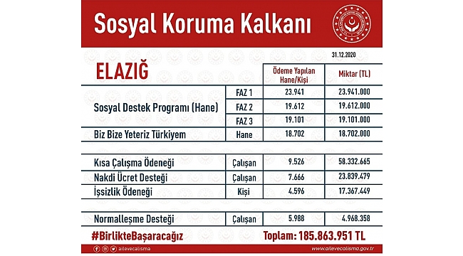 Elazığ'da Koronavirüs (Covid-19) ile mücadele kapsamında her türlü çalışma yapılırken, kısa çalışma ödeneğinden, nakdi ücret desteğine, sosyal destek programından normalleşme desteğine kadar 185 milyon 863 bin 951 TL ödendiği bildirildi.