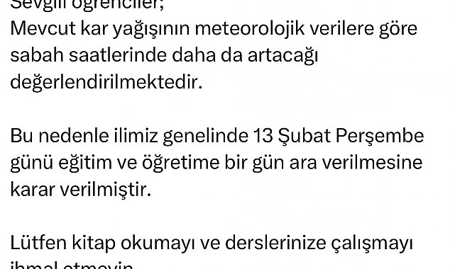 Elazığ Valisi Numan Hatipoğlu sosyal medya hesabından yaptığı açıklamada, "Mevcut kar yağışının meteorolojik verilere göre sabah saatlerinde daha da artacağı değerlendirilmektedir. Bu nedenle ilimiz genelinde 13 Şubat Perşembe günü eğitim ve öğretime bir gün ara verilmesine karar verilmiştir. Lütfen kitap okumayı ve derslerinize çalışmayı ihmal etmeyin. Ayrıca engelli çalışanlarımız ile hamile personeller de idari izinli sayılacaklardır" ifadelerini kullandı.