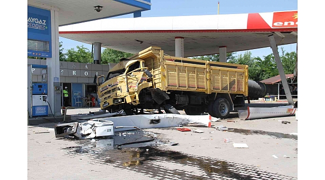 Elazığ'da sürücüsünün direksiyon hakimiyetini kaybettiği kamyon, önce seyir halindeki otomobile çarptı ardından akaryakıt istasyonuna girdi. 2 benzin pompasının yıkıldığı olayda facia ucuz atlatılırken, kazada 2'si ağır 5 kişi yaralandı.