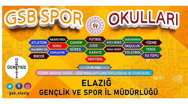 Gençlik ve Spor Bakanlığı tarafından her yıl 81 ilde düzenlenen GSB Spor Okulları ve GSB Engelsiz Spor Okulları kayıtları Elazığ'da da başladı. Elazığ Gençlik ve Spor İl Müdürlüğü tarafından yaz döneminde 20 farklı branşta ücretsiz olarak verilecek spor eğitimleri çocukların ve gençlerin bilişsel, sportif gelişimleri ile sosyalleşmelerine katkı sağlayacak. Spor tesislerinde antrenörler eşliğinde verilecek olan eğitimler ile 7-14 yaş arasındaki çocuklar ve gençler, ücretsiz spor yapma imkanı bulacak. Kayıtların Gençlik ve Spor İl Müdürlüğü Sportif Değerlendirme ve Takip Birimi tarafından alınacağı bildirildi.