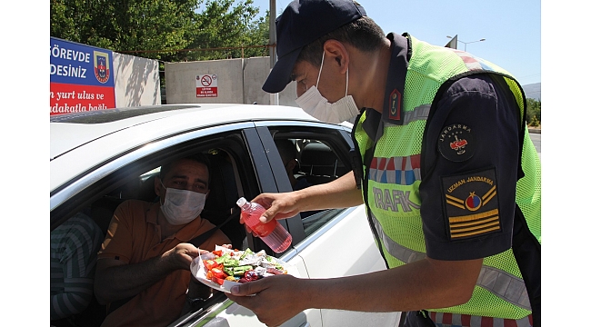 Elazığ'da bayramda da mesai yapan jandarma ekipleri, sürücülere şeker ve kolonya ikram ederken, çocuklara da boyama kitabı hediye edip uygulama gerçekleştirdi.