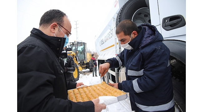 Elazığ'da 2 gündür etkili olan yoğun kar yağışı nedeniyle kapanan köy yollarını açmak için yürütülen çalışmaları yerinde inceleyen Vali Erkaya Yırık, ekiplere baklava ikram etti.