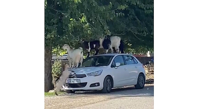 Akçakiraz beldesinde otlatılmak üzere dışarı salınan keçiler, bir süre otlandıktan ağaçlardaki yapraklara gözünü dikti. Keçiler, park halindeki otomobilin üzerine çıkarak yaprakları yemeye başladı. O anlar ise bir vatandaş tarafından cep telefonu kamerası ile kayda alındı.
